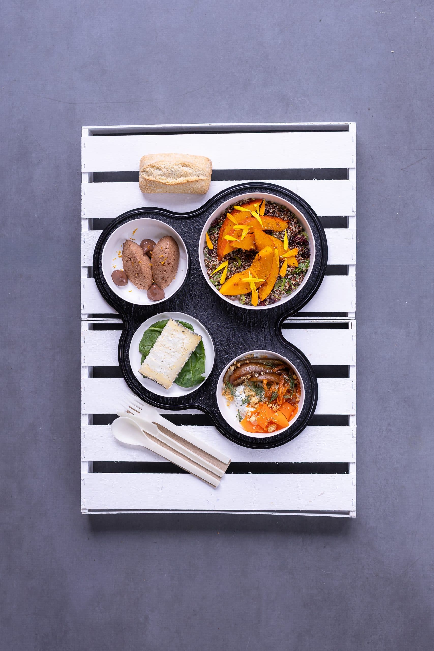 Plateau 'nuage' réutilisable et consigné, vaisselle et couverts recyclables, livré avec sel/poivre, pain blanc et serviette papier